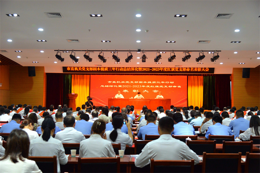 会议宣读了《关于市直机关2021-2023年度红旗党支部评选结果和固本提质三年行动党支部分类定级认定结果的通报》,为红旗党支部命名表彰对象代表颁发奖牌、证书。市民政局党组、市税务局机关党委、市政府办公室机关第四党支部、市委党校机关第一党支部、市知识产权和保护中心党支部、市应急管理综合执法支队党支部先后作交流发言。