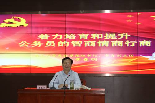 李春明指出,中国特色社会主义进入了新时代,开启了新征程,我们党要有新气象、新作为,对广大公务员提出了一系列新的更高的要求,需要不断培育和提升公务员的智商、情商与行商。