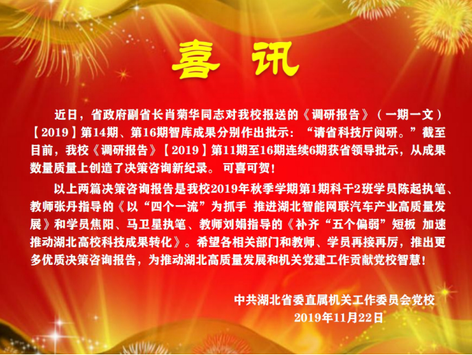 【喜讯】《调研报告》 2019第14期、16期获省领导批示