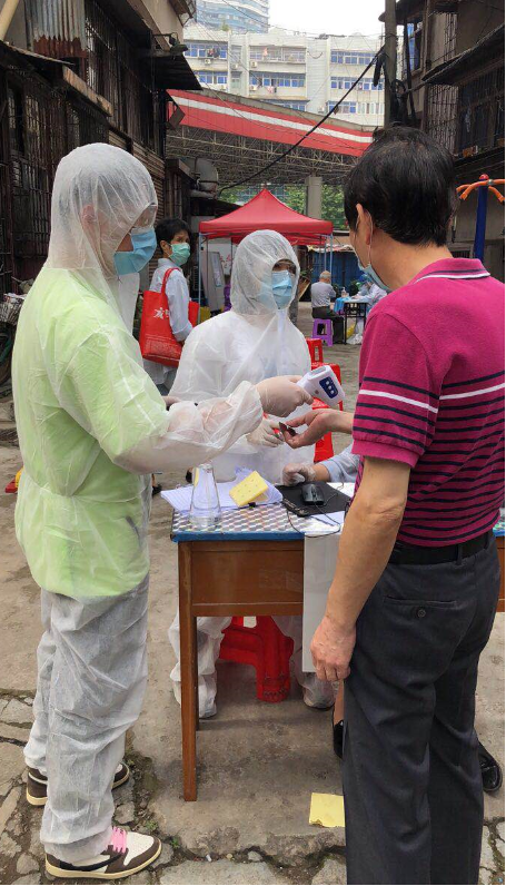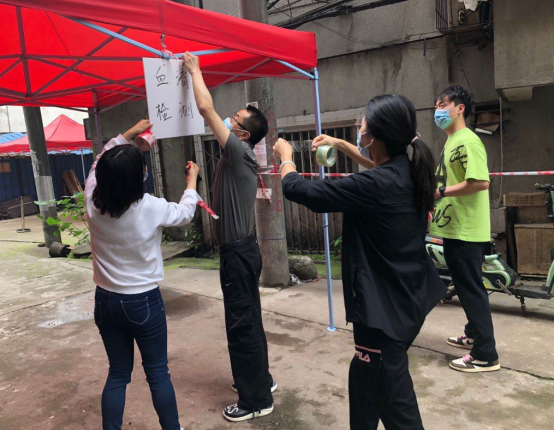 检测现场,志愿者同社区工作人员一道布置好场地,胡静负责居民身份信息核对,张云做好登记并发放检测号码凭条,王敬业守好入口为居民测量体温,组织每5人一组进入检测区域,曾照东在区域内维护好秩序,宋兰兰在出口回收第三张凭条,确认每个受测居民都做完核酸检测和血清检测两项检查。他们不断提醒居民保持1米安全间隔,避免交叉感染,确保现场安全有序,大家分工明确却又通力协作。