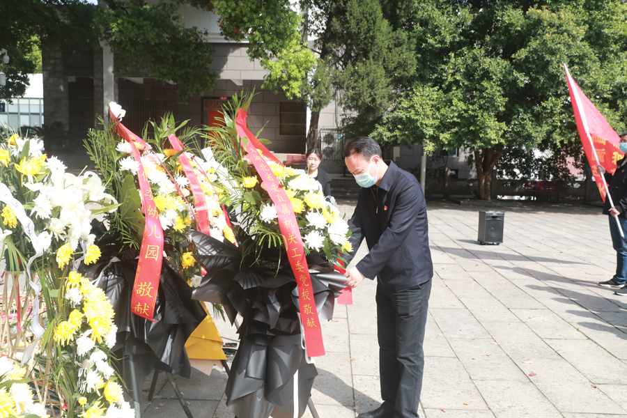 春日下的施洋烈士陵园内松柏掩映、宁静肃穆,雕像、纪念碑巍然耸立,庄严神圣。承载怀念和哀思的花篮郑重地摆放在施洋烈士雕像前,校长廖峰同志上前仔细整理花篮缎带。阳光下,红色缎带上书写的“革命烈士永垂不朽”熠熠生辉,盛放的鲜花寄托着对英烈的崇高敬意和无限哀思。70余名党员庄严肃穆的在雕像前列队,鞠躬行礼、默哀悼念,缅怀先烈。