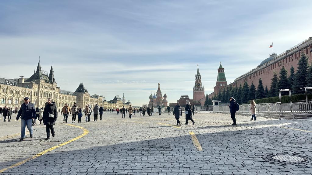 莫斯科红场上,蓝天白云,很多市民趁着好天气外出游玩。