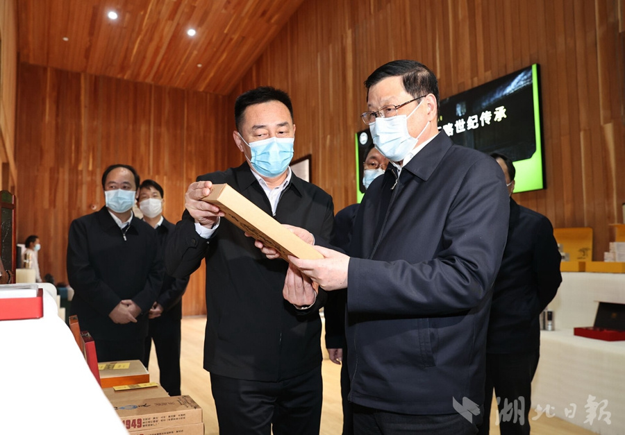 在羊楼洞茶生态文化产业园,应勇察看产品展示,了解赤壁青砖茶产业发展情况,对企业适应市场需求,推动赤壁青砖茶由重转轻、从历史和传统走向时尚和平常的做法点赞。
