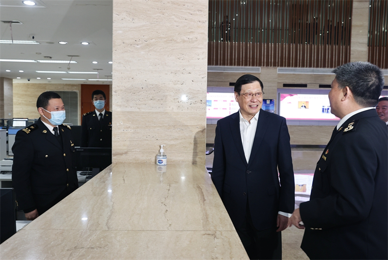 在武昌海关东湖综保区办事大厅,应勇看望窗口工作人员,对武汉海关突出“降、快、先、优”服务市场主体的做法点赞,希望武汉海关继续以信息化建设推动服务优化升级,助力我省开放型经济高质量发展。