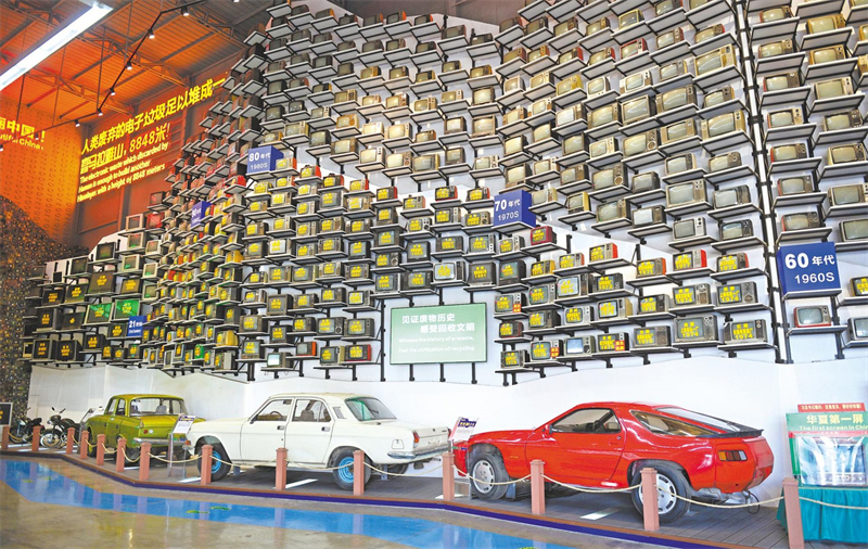走进废物艺术主题公园“变废为宝”站,一整面百年电视机墙和线路板墙组成两座“城市矿山”,警示人们每年报废的电子废弃物足以堆成一座喜马拉雅山。
