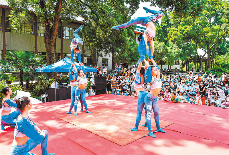 9月12日上午,武汉植物园温室前广场上人声鼎沸,武汉杂技团专场杂技正在此上演,柔木、单顶、魔术等8个精彩杂技节目,深受游人喜爱。据了解,中秋节期间,武汉植物园每天都有5场武汉杂技团和武汉歌舞剧院的文艺演出,供游人免费观赏。(湖北日报全媒记者 朱熙勇 摄)