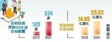 过去10年间,在鄂投资世界500强企业从105家跃升至324家,增长超2倍,数量居中部第一;实际利用外资(FDI)从14.85亿美元增至25.02亿美元,十年累计实际利用外资219.32亿美元。