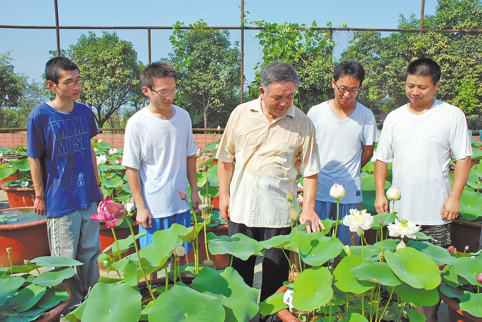 于丹(左二)带领学生在实验池深水区试种睡莲。